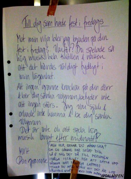 Borde inte den som skrivit tillägget leta upp grannen och säga till istället för att skriva en lapp på lappen?